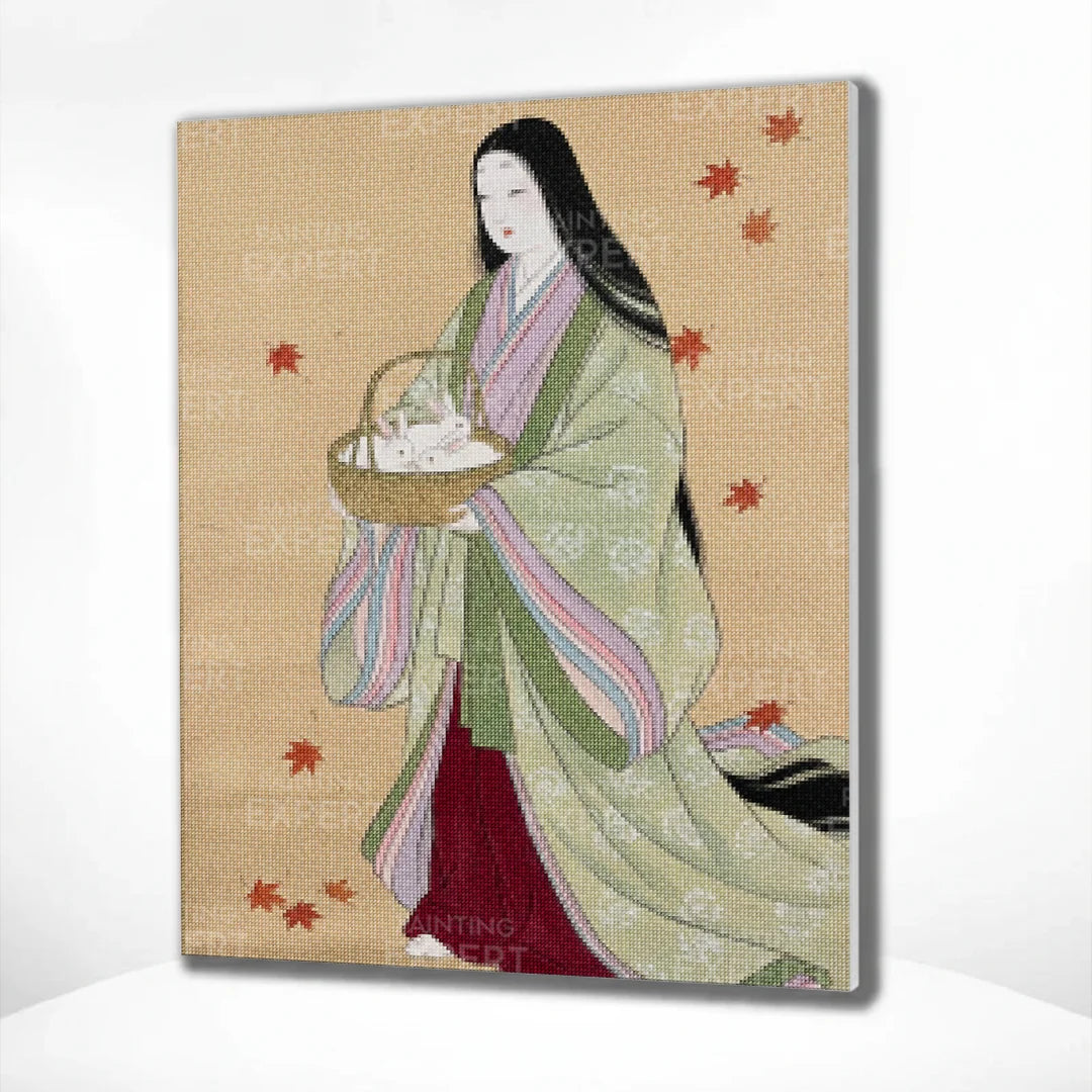 Diamond Painting Weiße Kaninchen im Herbstkorb Japan