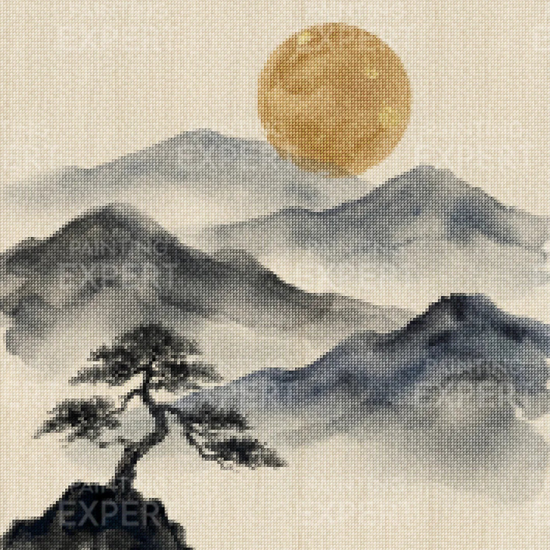 Diamond Painting Berge in Tinte mit goldenem Mond Japan