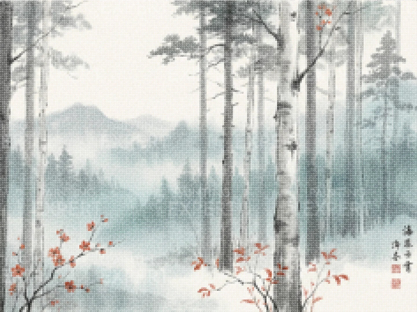 Diamond Painting Birkenwald im Nebel mit roten Akzenten Japan