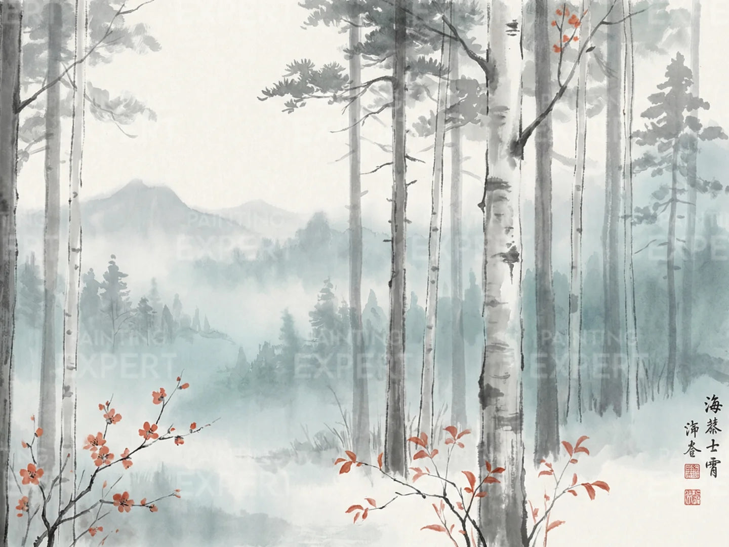 Malen nach Zahlen Birkenwald im Nebel mit roten Akzenten Japan