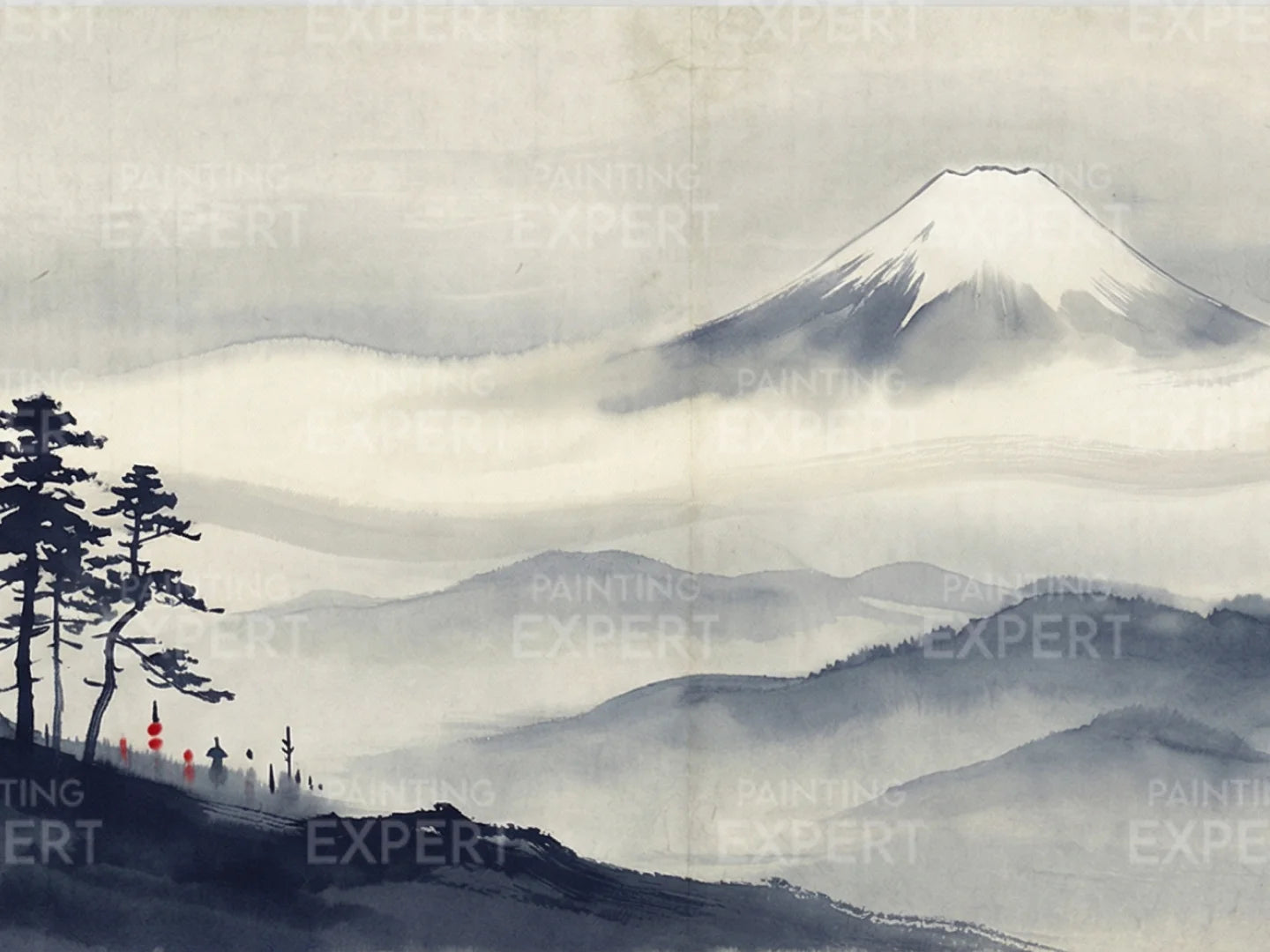 Malen nach Zahlen Kirschblüten vor nebelverhangenen Berggipfeln – Japandi-Panorama Japan