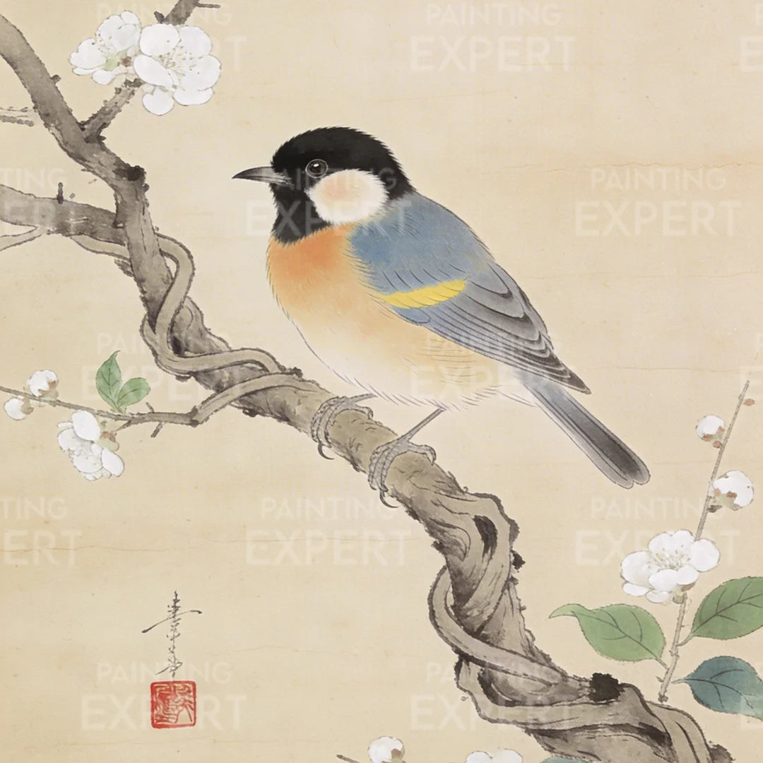 Malen nach Zahlen Kohlmeisen auf einem blühenden Zweig von Ohara Koson Japan