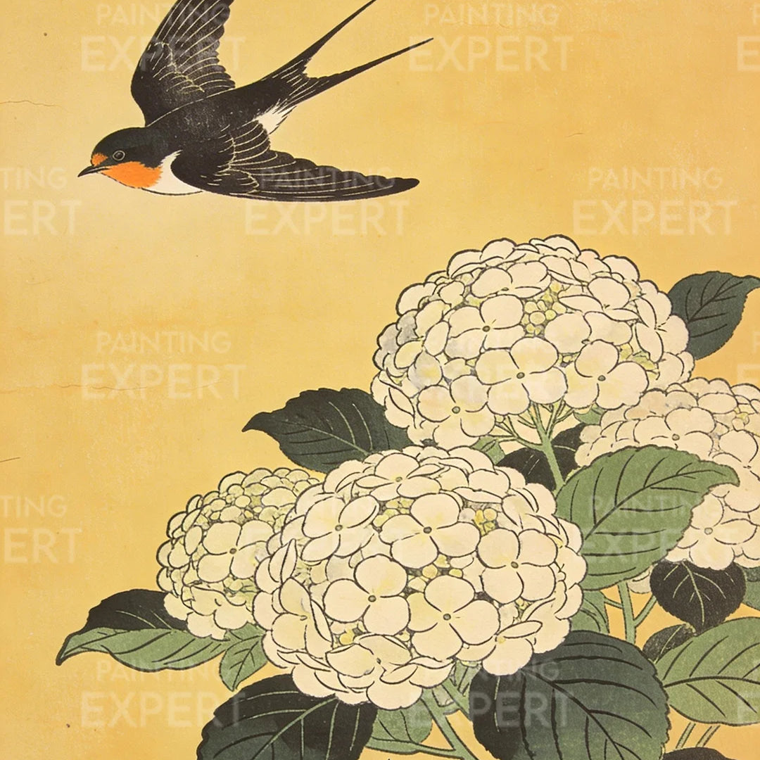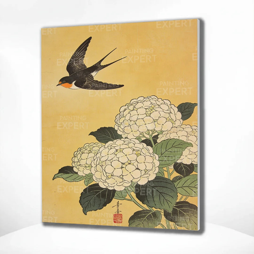 Malen nach Zahlen Schwalbe über weißen Hortensien Japan