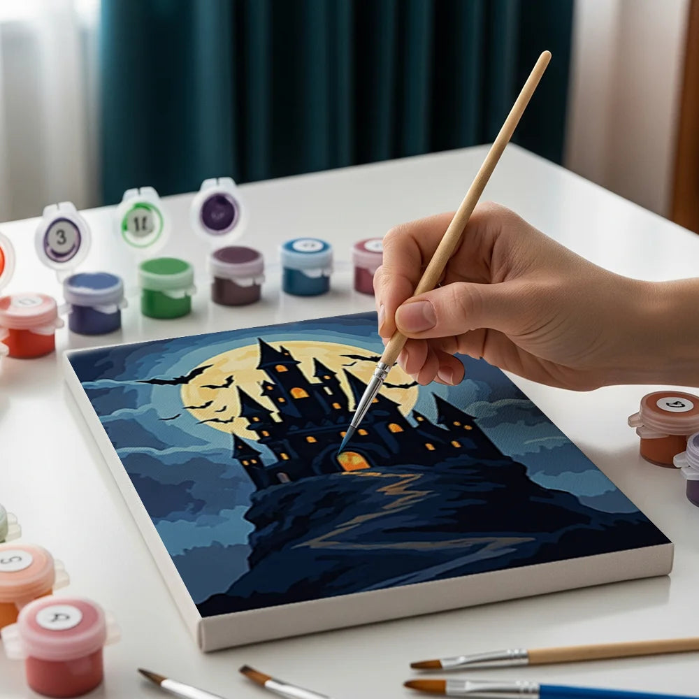 Dieses Spuknächte-Kollektion Mini-Set aus unserer Mini Malen nach Zahlen Kollektion ist ideal zum Verschenken, zum selbst Malen und anschließend zum Aufhängen an der Wand oder im Kinderzimmer. Das kompakte Format von 15 × 20 cm ermöglicht es, in 2–3 Stunden ein wunderschönes Kunstwerk zu erschaffen, ohne dass ein ganzer Abend dafür draufgeht.