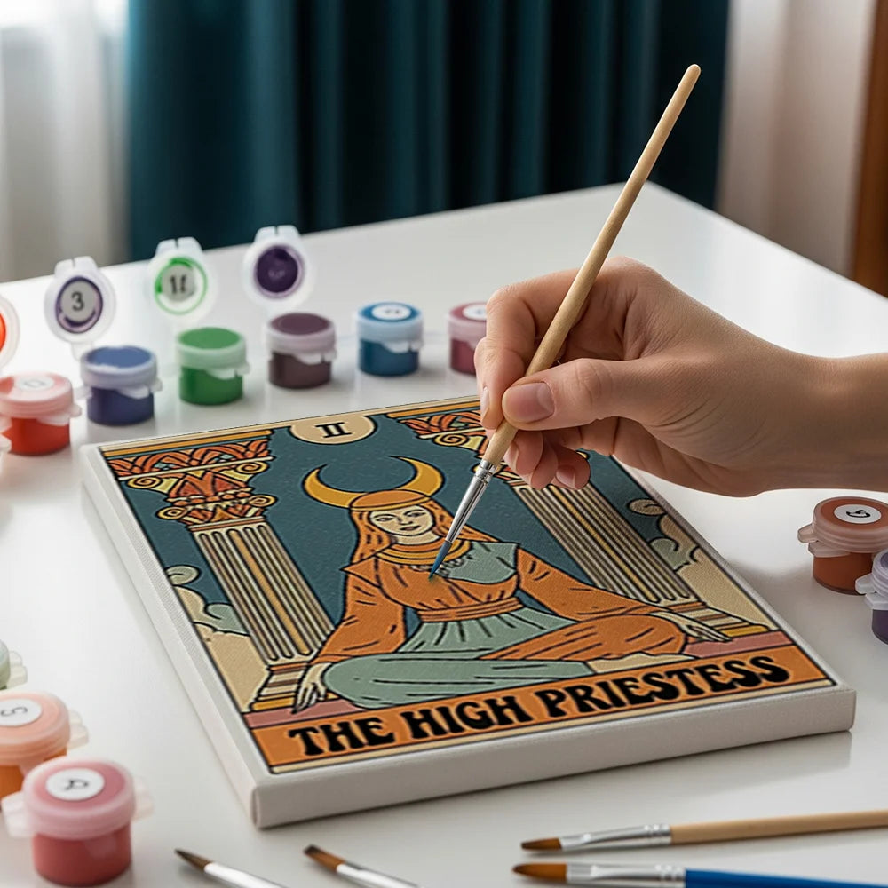 Dieses Tarot Vibe Kollektion Mini-Set aus unserer Mini Malen nach Zahlen Kollektion ist ideal zum Verschenken, zum selbst Malen und anschließend zum Aufhängen an der Wand oder im Kinderzimmer. Das kompakte Format von 15 × 20 cm ermöglicht es, in 2–3 Stunden ein wunderschönes Kunstwerk zu erschaffen, ohne dass ein ganzer Abend dafür draufgeht.