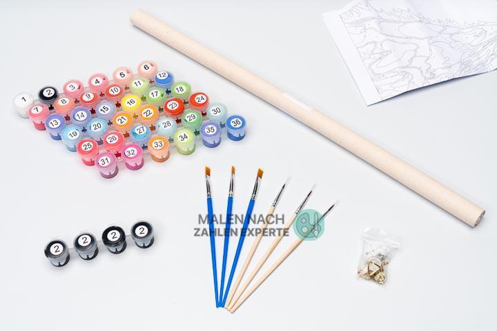 Bei Malen nach Zahlen Experte erhalten Sie ein komplettes Set mit hochwertigen Materialien, die speziell für unsere Produkte entwickelt wurden. Kein Aufwand – Sie können sofort beginnen! Das Set enthält: