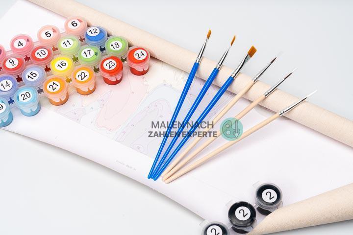 Bei Malen nach Zahlen Experte erhalten Sie ein komplettes Set mit hochwertigen Materialien, die speziell für unsere Produkte entwickelt wurden. Kein Aufwand – Sie können sofort beginnen! Das Set enthält: