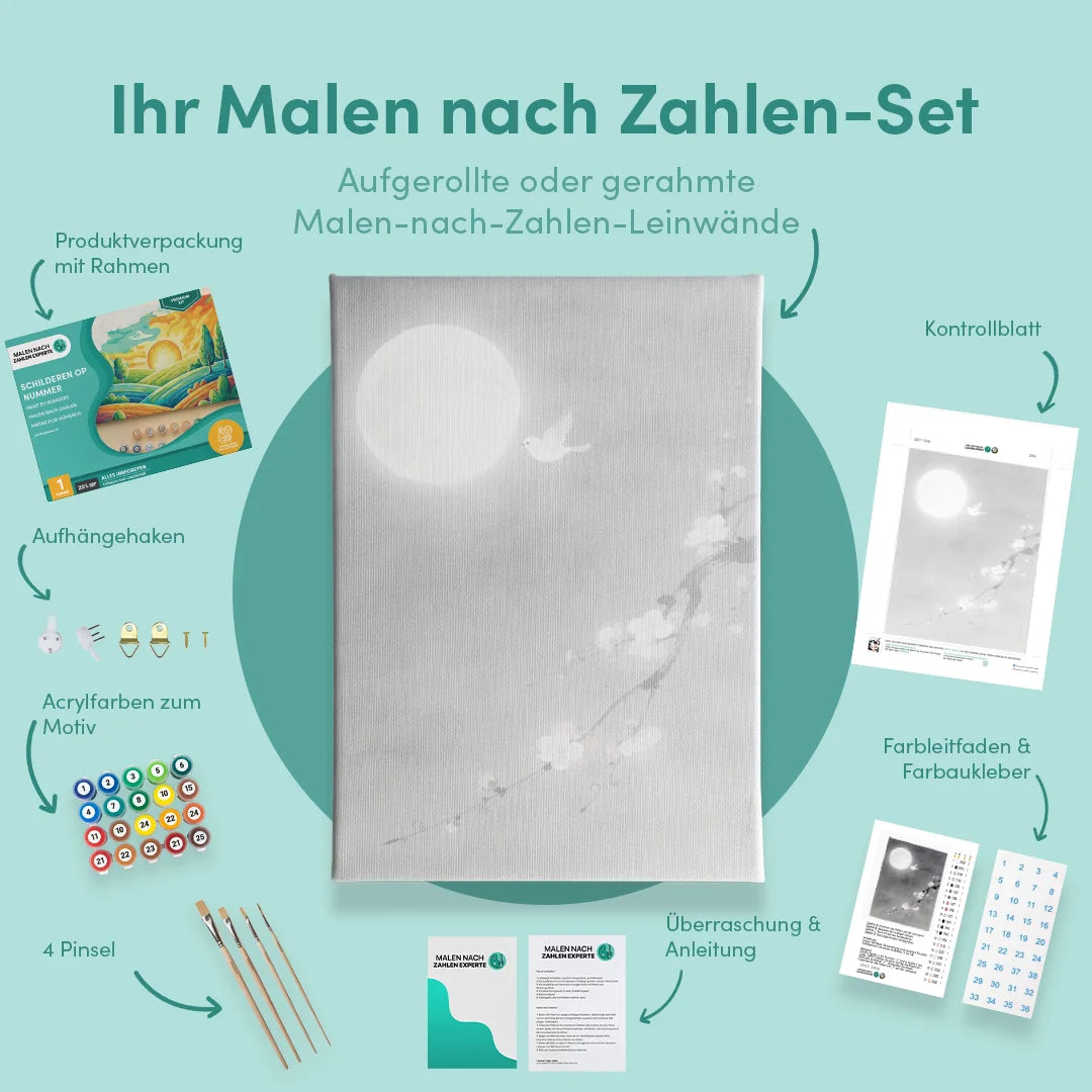 Bei Malen nach Zahlen Experte erhalten Sie ein komplettes Set mit hochwertigen Materialien, die speziell für unsere Produkte entwickelt wurden. Kein Aufwand – Sie können sofort beginnen! Das Set enthält: